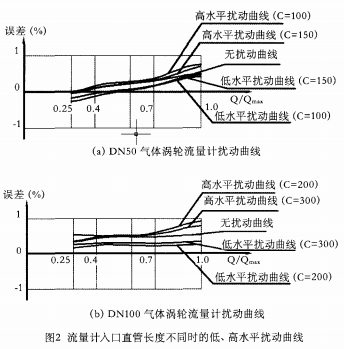 擾動試驗可以驗證氣體渦輪流量計抗干擾性能的好壞,在給定安裝條件下,擾動和非擾動條件下誤差相差越大,表的抗干擾性能就越差,壽命就會越短。按照prEN 12261的要求,在0.25Qmax~Qmax間,擾動和非擾動條件下的誤差變化應小于基本誤差限的1/3。丹東東發(fā)(集團)有限公司生產(chǎn)的氣體渦輪流量計在試驗流量范圍內的誤差限為±l%,當入口直管段長2DN(DN公稱直徑)時,擾動試驗前后的誤差變化即符合規(guī)定的要求。因此,該類流量計在安裝使用時,無論管道內流體的流動類型如何,只要入口直管段的長度達到2DN就可以了。