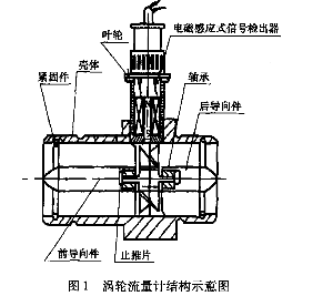 ①法蘭夾裝式液體渦輪流量計(jì):渦輪流量計(jì)是一種流量測(cè)量?jī)x表,流動(dòng)流體的動(dòng)力驅(qū)使渦輪葉片旋轉(zhuǎn),其旋轉(zhuǎn)速度與體積流量近似成比例(線性關(guān)系)。信號(hào)輸出方式包括脈沖、模擬量或數(shù)字通信方式。結(jié)構(gòu)原理見(jiàn)圖1。
