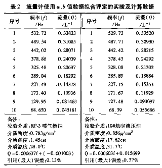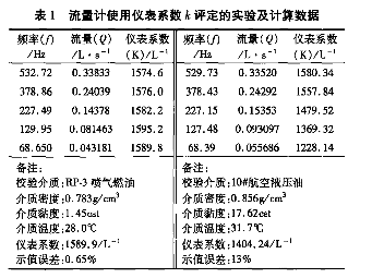 數(shù)據(jù)說(shuō)明:為了更直觀地探討流量計(jì)在合理選擇誤差評(píng)定的方法以及由此涉及儀表計(jì)量特性等具體因素的影響,故在表1和表2中均分別以航空RP-3號(hào)噴氣燃油(低黏度)、航空10號(hào)液壓油(中黏度)為檢定介質(zhì)在相同的量程下檢定分別出2組數(shù)據(jù);表1中誤差評(píng)定的計(jì)算公式來(lái)自JJG1037-2008《渦輪流量計(jì)檢定規(guī)程》(以下簡(jiǎn)稱規(guī)程)中(1)~(4),得出示值誤差(線性度);表2中誤差評(píng)定的計(jì)算來(lái)自*小二乘法運(yùn)算公式算出值進(jìn)行數(shù)據(jù)擬合求出理論值,*后得出儀表的引用誤差。此計(jì)算公式來(lái)自為《規(guī)程》以外的誤差評(píng)定方法。