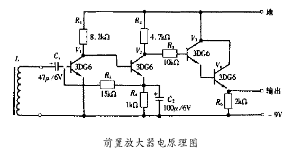 當(dāng)被測介質(zhì)(液體)通過變送器時(shí),推動(dòng)渦輪旋轉(zhuǎn),由于螺旋狀的渦輪是由導(dǎo)磁材料制成,所以旋轉(zhuǎn)后會周期性地增減線圈的磁通量,通過線圈感應(yīng)出頻率與流量成正比的脈沖電信號。此電信號較弱(約20mV~500mV),需經(jīng)前置大器放大(放大倍數(shù)約為,400左右)后,再送給流量指示、累積儀表處理。變送器由機(jī)械裝置(渦輪、導(dǎo)流件、殼體等)和電子裝置(前置放大器)組成。前置放大器安裝在殼體上部,兩裝置之間通過螺紋連接。前置放大器的電原理如下圖所示,共由四級電路組成,前兩級是電壓放大,后兩級是射*組合輸出。