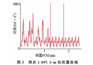 T-××-××1井是大慶油田采油五廠1口水驅(qū)產(chǎn)出井,采用阻抗式含水率計(jì)在該井進(jìn)行了測(cè)試。圖3、圖4分別為測(cè)點(diǎn)深度1097.3m測(cè)量的流量及混相值曲線圖。2min的采樣時(shí)間內(nèi),流量及混相值曲線波動(dòng)劇烈,明顯受井下產(chǎn)氣影響,進(jìn)行平均值計(jì)算時(shí)只能取后半段較平穩(wěn)的數(shù)據(jù),因此,測(cè)試時(shí)需延長(zhǎng)測(cè)量時(shí)間。錄取不同范圍數(shù)值時(shí)流量及含水率測(cè)量差值較大,流量平穩(wěn)段為14.81m3/d,高值時(shí)達(dá)到23.52m3/d;取不同測(cè)量段的混相值時(shí)測(cè)量含水率*大相差12%。重復(fù)測(cè)量得到了相同的測(cè)量結(jié)果。由此可見,氣體對(duì)流量及含水率測(cè)量產(chǎn)生了非常大的測(cè)量誤差。