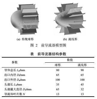 由于ρ和v為流體流動(dòng)參數(shù),不能隨意增減,因此只能盡量減小壓損系數(shù)α,以達(dá)到降低壓損的目的。壓損系數(shù)除了受流體粘性、管徑及管長(zhǎng)等因素影響外,與流量計(jì)內(nèi)部各部件的幾何結(jié)構(gòu)有密切關(guān)系。文獻(xiàn)通過試驗(yàn)發(fā)現(xiàn)葉輪的形線、葉片數(shù)對(duì)壓力損失的影響較小(≤3%),因前導(dǎo)流器對(duì)流量計(jì)有著重要作用,故將傳統(tǒng)的球形前導(dǎo)流器改進(jìn)為流線形,考察兩者在流動(dòng)減阻方面的不同,進(jìn)而分析對(duì)流量計(jì)性能的影響程度。DN100渦輪流量計(jì)改進(jìn)前后的前導(dǎo)流器結(jié)構(gòu)如圖2所示,幾何參數(shù)見下表。