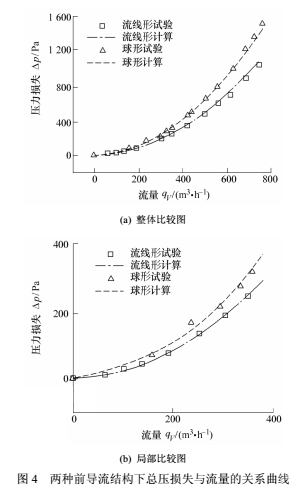 由圖4可知,兩種結(jié)構(gòu)下的計(jì)算與試驗(yàn)值符合很好,誤差在全量程范圍內(nèi)均小于5%。在小流量(≤200 m³/h)區(qū),無論是計(jì)算值還是試驗(yàn)值,兩種結(jié)構(gòu)的壓損值相差非常小,說明前導(dǎo)流結(jié)構(gòu)在流量較小時(shí)對(duì)壓損的影響不明顯。隨著流量的增大,結(jié)構(gòu)導(dǎo)致的壓力損失出現(xiàn)了較大差別,明顯看到,流線形與球形的數(shù)值差距越來越大,在*大流量處(約 750 m³/h),球形壓損比流線形增大約30%。
