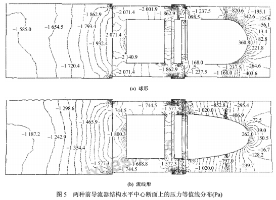圖5為兩種前導(dǎo)流器結(jié)構(gòu)水平中心斷面上的壓力等值線分布,宏觀上,圖5a、5b的壓力變化趨勢(shì)是一致的:在前導(dǎo)流器、葉輪和支架部分,壓力均不同程度地降低,由支架進(jìn)入尾流區(qū)后,壓力逐步上升。