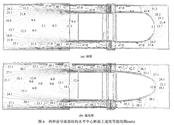 圖6為與圖5相同位置上的速度等值線分布。在前導(dǎo)流器處,可看出對(duì)應(yīng)壓力變化劇烈的區(qū)域,速度變化也較大。球形頭部速度急劇增大、直管段速度幾乎不變的分布趨勢(shì)使其中心出口速度(47.0m/s)較大(流線形45.2m/s),在同流量下表明球形前導(dǎo)流器具有較大速度梯度。當(dāng)氣流進(jìn)入尾流部分后,由于流道突擴(kuò),在支架的背面形成明顯的低速渦區(qū),之后管壁附近速度降低,中心區(qū)主流速度回升,速度值被逐漸拉平,對(duì)應(yīng)壓力也逐步回升??煽吹?,至出口斷面,流線形的速度不均勻*大差值為6.0m/s,球形為9.4m/s,即球形的出口速度梯度更大,壓力回升則相應(yīng)較慢。