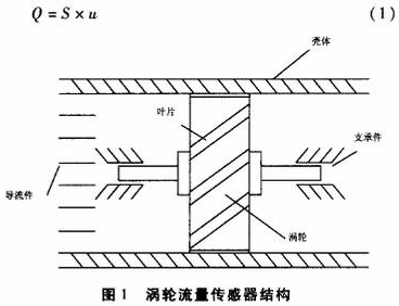 渦輪流量傳感器結構如圖1所示,屬于速度式流量傳感器。渦輪置于流體通道中,隨著流體的流動產生旋轉,設渦輪的轉速為n、流過渦輪的流體速度為u,則n與u成正比;流體通道的流通截面.積S是已知的常數(shù),所以,流過渦輪流量傳感器的流體體積流量Q為: