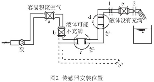 液體流動(dòng)方向必須與傳感器殼體上箭頭方向一致。對于能正反向測量的冷凍水回水流量計(jì),若方向不一致雖仍可測量,但設(shè)定的顯示流動(dòng)正反方向不符,必須改正之。若拆傳感器工作量大,也可改變傳感器上箭頭方向和重新設(shè)定顯示儀表符號。管道未充滿液體主要是管網(wǎng)工程設(shè)計(jì)或傳感器安裝位置不妥,使傳感器測量管內(nèi)不能充滿液體。應(yīng)采取措施,避免安裝如圖2所示a,e位置和以虛線管排放時(shí)b位置,改裝到c,d位置。
