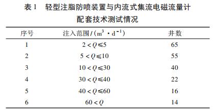 在實(shí)際應(yīng)用中,使用輕型注脂防噴裝置與內(nèi)流式集流甲醇計(jì)量表配套技術(shù)對(duì)喇叭口在射孔層上注聚井進(jìn)行測(cè)試。輕型注脂防噴裝置與內(nèi)流式集流甲醇計(jì)量表配套技術(shù)施工工藝參見(jiàn)文獻(xiàn),測(cè)試情況見(jiàn)表 1 所示,低注入量井( ≤10 m3 /d) 占到 56. 60% 。