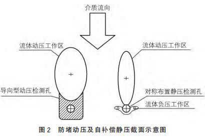 新智能液體渦輪流量表采用拋物面導向型結構作為動壓測點,采用對稱自補償型式的靜壓測點,可以有效地解決來流方向偏流時信號的穩(wěn)定采集,來流偏離管道軸線時,可以維持輸出差壓基本不變,如圖2所示。