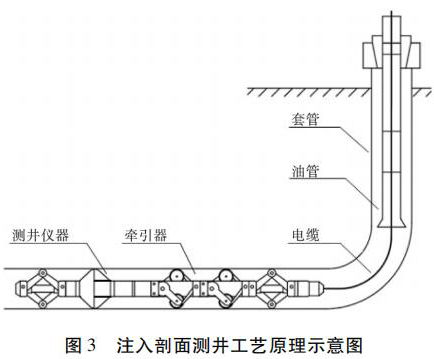 水平井注水井注入剖面測井工藝原理如圖 3 所示。在垂直井段,儀器在重力作用下可以通過注入管柱下入到井內(nèi),注入管柱下端須裝有喇叭口,且喇叭口應(yīng)在造斜點以上,保證測井完成后儀器順利起出,不發(fā)生卡儀器問題。儀器通過喇叭口以后在重力作用下繼續(xù)向下移動,當(dāng)儀器不能靠重力下移時,啟動牽引器,利用牽引器將儀器推送到井底,上提電纜過程中進行測井。