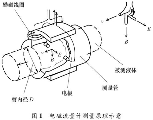 焦油流量計的測量原理如圖 1 所示。根據(jù)法拉*電磁感應定律,導電液體在磁場中流動會產(chǎn)生電動勢 E,它與磁感應強度 B、導電液體平均流速 v 成一定比例關系: