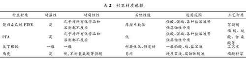 焦油流量計要根據(jù)被測流體的溫度、壓力、速度以及含固顆粒的硬度、含量和粒徑大小來決定測量管內(nèi)襯的材質(zhì)。該濕法磷酸裝置中,焦油流量計測量管襯里材質(zhì)的種類見表 2。