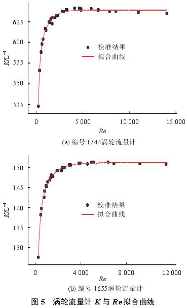 利用雙指數(shù)衰減函數(shù)對儀表系數(shù)與雷諾數(shù)關(guān)系進(jìn)行擬合,在層流范圍內(nèi)(Re<2300),儀表系數(shù)隨Re增加迅速增加,尤其是在Re<1000范圍內(nèi)更加明顯;而在Re>3000紊流范圍內(nèi),儀表系數(shù)變化平緩,接近常數(shù);在1000