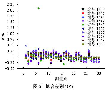 選取與以上要求的9個關(guān)鍵雷諾數(shù)相近的流量點數(shù)據(jù)進(jìn)行擬合,并與全數(shù)據(jù)擬合結(jié)果進(jìn)行比較,兩者差別通過式(9)進(jìn)行評估。圖6是兩種擬合方式差別分布情況。300對數(shù)據(jù)點中,僅有1點儀表系數(shù)差別超過2%,其他各點差別均小于0.5%,而且99%以上的數(shù)據(jù)點差別小于±0.33%,86%以上的數(shù)據(jù)點差別小于±0.20%。