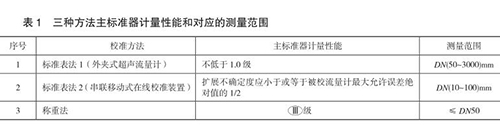 三種方法標(biāo)準(zhǔn)器的測(cè)量范圍應(yīng)覆蓋被校流量計(jì)的測(cè)量范圍。標(biāo)準(zhǔn)表法 1 中,超聲波流量計(jì)在實(shí)驗(yàn)室不同管道口徑和不同管道材質(zhì)標(biāo)定的系數(shù)各不相同,為提高在線校準(zhǔn)準(zhǔn)確度,應(yīng)將超聲流量計(jì)的換能器探頭在實(shí)驗(yàn)室用不同管徑、不同材質(zhì)的管道進(jìn)行流量修正系數(shù)的標(biāo)定,標(biāo)準(zhǔn)表現(xiàn)場(chǎng)使用時(shí)的條件與實(shí)驗(yàn)室溯源的條件應(yīng)保持一致或接近。