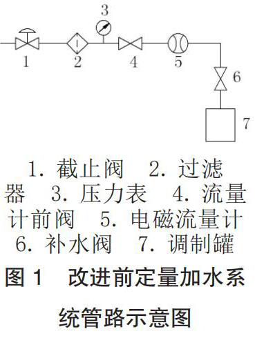 工廠的香料廚房系統(tǒng)為國內(nèi)煙機(jī)公司 2004 年設(shè)計(jì)制造,其定量加水系統(tǒng)主要由水源、乙醇流量計(jì)、加水管路元件和控制程序這四部分組成,改進(jìn)前管路示意圖如圖 1 所示。