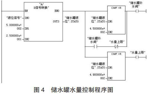 (2)程序設(shè)計(jì)。儲(chǔ)水罐水量控制的工作過程為:當(dāng)壓力變送器檢測(cè)到儲(chǔ)水罐的水量低于 450kg 時(shí),補(bǔ)水閥 3 開啟為儲(chǔ)水罐補(bǔ)水;當(dāng)水量達(dá)到 490kg 時(shí),補(bǔ)水閥 3 關(guān)閉;生產(chǎn)配制過程中,循環(huán)以上控制過程。儲(chǔ)水罐水量控制的程序如圖 4 所示。