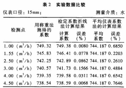 被檢儀表:公稱通徑分別為10mm和15mm的渦輪流量傳感器各一臺;檢定裝置:靜態(tài)稱重法標(biāo)準(zhǔn)水流量檢定裝置,系統(tǒng)精度+0.2%。分別采用常規(guī)的平均儀表系數(shù)法和檢定系數(shù)折線法進(jìn)行標(biāo).定,并與作為標(biāo)準(zhǔn)的靜態(tài)稱重法的檢定結(jié)果進(jìn)行比對,結(jié)果見表1.表2。