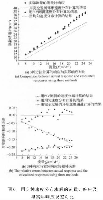 分別計算各個響應(yīng)在不同流量點處與真實響應(yīng)的相對誤差,結(jié)果如圖6(b)所示。從圖中可以明顯看出,用PIV獲得的速度分布計算的結(jié)果與實際響應(yīng)的相對誤差*小,在3%以內(nèi);用均勻入口速度分布計算的結(jié)果誤差*大;用完全發(fā)展的環(huán)形通道速度分布當(dāng)雷諾數(shù)超過2000時,由于計算模型假設(shè)由層流的速度分布直接轉(zhuǎn)變?yōu)橥牧鞯乃俣确植寄P?,未能合理地反映實際流動中逐步轉(zhuǎn)變的過渡階段,導(dǎo)致理論結(jié)果與實際速度分布有較大差異,所以誤差較大。通過這些對比不難看出,獲得真實的速度分布能更為準確地計算柴油計量表的實際響應(yīng)。面對復(fù)雜的上游來流條件,PIV結(jié)果更能反映柴油計量表內(nèi)部流動的主要特征,這也從另一個側(cè)面表明,對柴油計量表內(nèi)部復(fù)雜流動的精細測量和深入認識也將是完善相關(guān)理論和進一步優(yōu)化其性能的重要途徑。