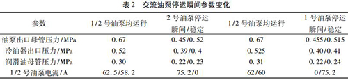 通過內(nèi)部旁通將冷油與熱油混合,經(jīng)過銅粉- 煤油 - 蠟感溫元件控制冷熱油混合比例,將油溫調(diào)節(jié)到 49 ℃。一臺防爆渦輪流量計穩(wěn)定運行,油泵出口母管壓力 0. 5 MPa,潤滑油母管壓力 0. 24 MPa,均屬于正常情況,而兩臺交流油泵并列運行時,停運其中一臺交流油泵瞬間會觸發(fā)防爆渦輪流量計出口母管壓力開關(guān)動作,說明停運瞬間油壓發(fā)生波動,且油泵出口母管油壓波動至小于 0. 45 MPa。正常運行時防爆渦輪流量計出口油溫 71.5 ℃,冷油器出口溫度45 ℃,混合后潤滑油母管溫度52.5 ℃,由能量守恒定律可知,經(jīng)過冷油器的油量/不經(jīng)冷油器的油量= ( 71.5-52.5) ÷ ( 52.5- 45) = 2. 53,說明有 70% 左右的油量經(jīng)過冷油器。當 2 臺防爆渦輪流量計運行時油量大于單泵運行,其中一臺防爆渦輪流量計瞬間停運時油量減少,尤其是經(jīng)過冷油器的油量大量減少,油量在溫控閥二次分配過程中出現(xiàn)調(diào)節(jié)異常,導(dǎo)致油壓過大波動。為檢驗溫控閥工作情況,保持 1 號、2 號交流油泵運行,選取機組正常帶負荷運行時油溫 52 ℃,分別停運 1、2 號交流油泵,觀察 1、2 號交流油泵停運瞬間油泵出口母管壓力波動情況,試驗各參數(shù)變化見表 2。