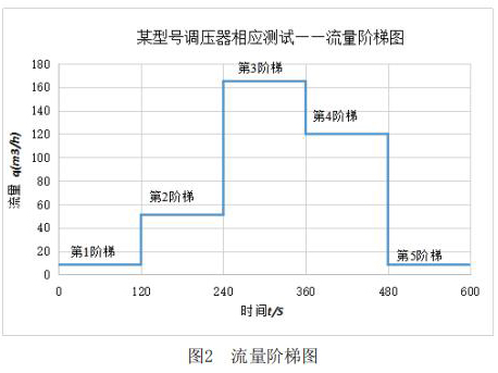 該測試主要利用實(shí)驗(yàn)室測試條件,模擬客戶現(xiàn)場使用情況。其主要測試內(nèi)容包括:測試液體智能渦輪流量計(jì)在+23℃,-30℃和-40℃三種溫度下,液體智能渦輪流量計(jì)出口壓力分別在2.1kPa和30kPa時(shí),流量分別從*1階梯到*5階梯時(shí)的響應(yīng)速度,客戶所提供的流量階梯如圖2所示。橫軸表示下游球閥開啟動(dòng)作時(shí)間,縱軸表示液體智能渦輪流量計(jì)下游需要的流量q。