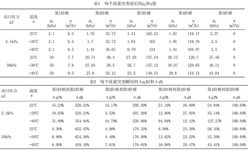 為了深入研究溫度及流量突變對液體智能渦輪流量計(jì)響應(yīng)速度的影響趨勢,把每個(gè)流量突變點(diǎn)前后的出口壓力p2,流量q列表如表1所示。