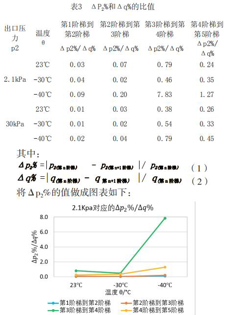 為了更直觀嚴(yán)謹(jǐn)?shù)膶Ρ让總€(gè)階段響應(yīng)速度的不同,對原始數(shù)據(jù)進(jìn)行處理,得到如下表格2和表格3。將△p2%/△q%作為響應(yīng)速度的直觀量化表達(dá),若△p2%/△q%的值大,說明單位流量變化照成的出口壓力變化大,即說明液體智能渦輪流量計(jì)響應(yīng)相對較慢,反之亦然。