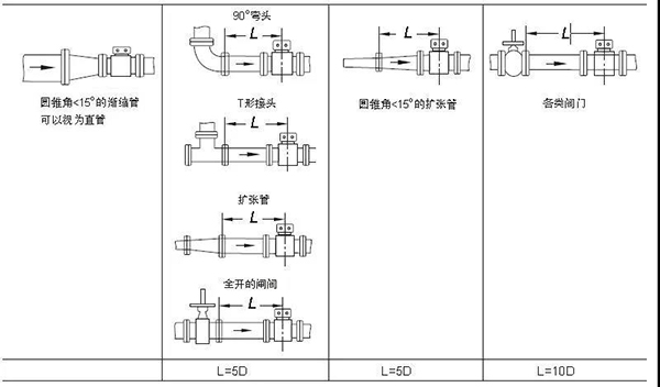 得出圖3的流速曲線有一個前提條件,就是保證流量計前后直管段的要求。為了使流過傳感器介質(zhì)流態(tài)穩(wěn)定,測量精度不受流速分布影響,通常對流量計直管段長度要求上游10D、下游5D(D為電磁流量計口徑),如圖4所示。直管段是從污泥流量計傳感器中點算起,并是不很多人以為的法蘭連接處算起。
