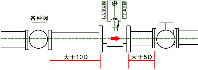 1、對(duì)直管段的要求:渦輪流量計(jì)必須水平安裝在管道上(管道傾斜在5以內(nèi)),安裝時(shí)流量計(jì)軸線應(yīng)與管道軸線同心,流向要一致。渦輪流量計(jì)上游管道長(zhǎng)度應(yīng)有不小于2D的等徑直管段,如果安裝場(chǎng)所充許建議上游直管段為20D、下游為5D。
