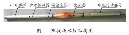 阻抗找水儀結(jié)構(gòu)如圖 1 所示,它主要由含水率計(jì)和產(chǎn)量計(jì)兩部分組成。含水率計(jì)部分主要由電路筒、含水率傳感器組成。產(chǎn)量計(jì)部分主要由dn50液體渦輪流量計(jì)、集流器及電機(jī)傳動(dòng)部分組成。