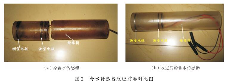 針對(duì)含水測(cè)量時(shí)出現(xiàn)的問(wèn)題,我們對(duì)含水率傳感器進(jìn)行改進(jìn)。改進(jìn)后的含水傳感器為絕緣筒內(nèi)嵌電*環(huán)一體設(shè)計(jì),表面不存在縫隙,避免了流體的漏失,防止了傳感器測(cè)量電*電信號(hào)的分流,保證了含水測(cè)量精度,如圖 2(b)所示。