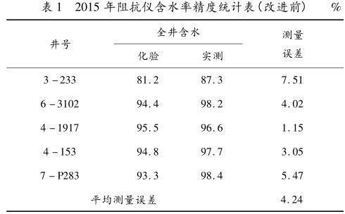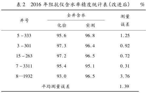 對(duì) 2015 年和 2016 年含水率傳感器改進(jìn)前、后同一時(shí)期(3 月份)的含水率測(cè)量精度進(jìn)行了統(tǒng)計(jì),見(jiàn)表 1、表2。改進(jìn)后的含水率傳感器測(cè)量精度提高了 2.85%。