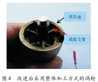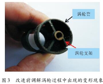在對(duì)影響儀器流量測(cè)量的調(diào)查中發(fā)現(xiàn),dn50液體渦輪流量計(jì)支架不同心。dn50液體渦輪流量計(jì)是阻抗找水儀流量測(cè)量的核心部件,采用的加工方式是先加工渦輪上下支架再焊接在渦輪套上,因此渦輪上下支架不容易保持同心,影響了支架上渦輪葉片轉(zhuǎn)動(dòng)的靈活性,導(dǎo)致流量測(cè)量時(shí)啟動(dòng)排量達(dá) 3 ~ 5 m 3 /d,高于技術(shù)文件上規(guī)定的 2 m 3 /d。且由于渦輪支架是焊接在渦輪套上的,在測(cè)井過(guò)程中常出現(xiàn)渦輪支架扭曲變形、開(kāi)焊而影響測(cè)井成功率。改進(jìn)前調(diào)解渦輪過(guò)程中出現(xiàn)的變形現(xiàn)象如圖 3 所示。在2015 年 182 口產(chǎn)出剖面測(cè)井中,因此而未測(cè)成的井?dāng)?shù)達(dá) 26 口之多,占全年產(chǎn)出剖面測(cè)井任務(wù)的 14.3% 。