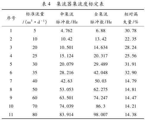 從表 4 我們發(fā)現(xiàn),該儀器 40 m 3 /d 流量以上的漏失量相對(duì)恒定,低流量漏失量偏大,由此我們判斷該儀器集流器不合格。分析檢查后發(fā)現(xiàn),集流器傘布的綁扎位置出現(xiàn)問(wèn)題,是導(dǎo)致其低流量漏失偏大的原因,需要重新維修。通過(guò)對(duì)儀器集流度的檢測(cè),根據(jù)相對(duì)漏失量,我們可以很容易地判斷出集流器的集流程度,*大限度地保障了儀器的測(cè)量質(zhì)量。
