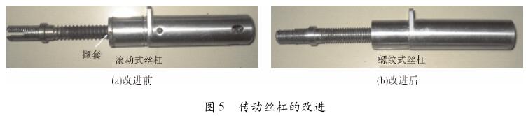 我們對(duì)電機(jī)傳動(dòng)絲杠的結(jié)構(gòu)進(jìn)行了改進(jìn),去掉原有的擷套及滾珠,改為 M8 ×1.25 螺紋式,如圖 5(b)所示。改造后的傳動(dòng)絲杠采用了精加工工藝,研磨度為1.6 ,由于制造精度高,不會(huì)增加阻力。與原有的滾珠式電機(jī)傳動(dòng)絲杠相比較,現(xiàn)有的螺紋式電機(jī)傳動(dòng)絲杠不易產(chǎn)生滑扣現(xiàn)象,耐用、可靠。