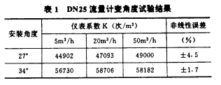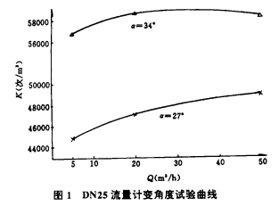 對DN25流量計分別做了葉片安裝角a為27°和34°的變角度試驗,其結果見表1和圖1。