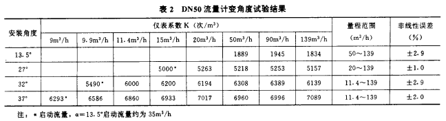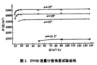 對DN50流量計分別做了a為13.5°、27°、32°和37°變角度試驗,其結果見表2和圖2。