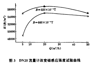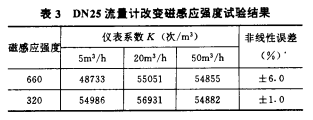 位于流量計之上,緊貼殼體處安裝著磁電轉換器,它將對渦輪葉片(由鐵磁性材料制成)產生一個恒定的磁性阻力矩。無論葉片處在靜止或轉動過程中都將始終受到這一磁力作用。這一磁力將直接影響著流量計的性能,尤其小流量時影響更大。為了研究該磁力對流量計性能的影響情況,我們選取適當?shù)拇鸥袘獜姸?,對同一臺DN25流量計進行了變磁感應強度B的影響試驗,其試驗結果見表3和圖3。