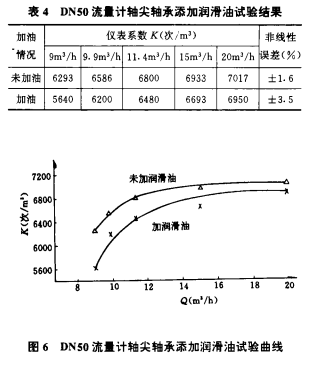 通常,流量計在出廠標定前都在軸尖和軸承處加入少量的潤滑油,以防軸尖和軸承磨損過快。但是,由于潤滑油具有一定的粘性,它將影響流量計的性能,故我們對同一臺流量計做了不加潤滑油和加潤滑油的試驗,其試驗結果見表4和圖6.