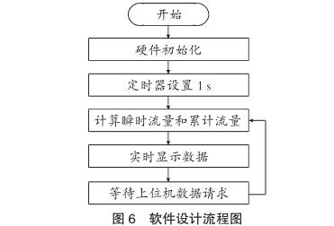 上電后程序?qū)SP的硬件資源進行初始化,包括中斷系統(tǒng)、GPIO口、定時器/計數(shù)器、通信端口及基本的時鐘設置。程序每秒對接收到的脈沖進行計數(shù),其除以儀表系數(shù)后的結果作為瞬時流量,同時在時間上對瞬時流量進行累積,計算出兩種流量后,將其實時顯示在液晶顯示屏上,同時將數(shù)據(jù)保存,**等待上位機電腦對數(shù)據(jù)的讀取。通信采用MODBUS協(xié)議,波特率為9600b/s,無校驗,8位數(shù)據(jù)位,1位停止位。圖6為微處理器功能設計流程圖。