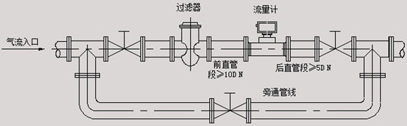 渦輪流量計的安裝有法蘭連接、螺紋連接及夾裝式三種方式。安裝時液體流動方向應(yīng)與傳感器外殼上指示流向的箭頭方向一致,且上游直管段應(yīng)大于等于20倍管徑,下游直管段大于等于5倍管徑。