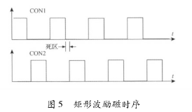 該電路主要由勵磁時序發(fā)生單元、三態(tài)緩沖器及隔離光耦組成。勵磁時序由消防系統(tǒng)回水流量計系統(tǒng)的控制核心產(chǎn)生。采用DSP的EPWM外設(shè)模塊,通過設(shè)定其內(nèi)部定時器的工作模式發(fā)出所要求的勵磁頻率的勵磁時序PWM信號CT_1和CT_2。由于勵磁控制系統(tǒng)中的勵磁工作電源的電壓要比DSP的工作電源電壓高得多,為防止勵磁電路故障對系統(tǒng)控制核心產(chǎn)生致命影響,采用光耦將控制部分與勵磁部分進(jìn)行隔離。另外,由于DSP引腳的驅(qū)動能力有限,所以在DSP與隔離光耦之間加入三態(tài)緩沖器以驅(qū)動隔離光耦的輸入級。并且,DSP能夠通過GPIO口控制三態(tài)緩沖器上的使能引腳來使能和禁止勵磁,以在檢測到電路故障時迅速關(guān)斷H橋所有橋臂。該勵磁時序產(chǎn)生電路通過軟件編程可產(chǎn)生如圖5所示的單頻矩形波。在實(shí)際應(yīng)用中,由于組成H橋的達(dá)林頓三*管與MOS管導(dǎo)通與關(guān)斷的時間不一致,易在勵磁方向切換瞬間,產(chǎn)生上下橋臂同時導(dǎo)通的現(xiàn)象,反映在勵磁電流波形上為一幅值很高的窄脈沖。該脈沖電流不僅容易引起遲滯比較電路的誤輸出,從而導(dǎo)致高低壓切換電路與電流旁路電路的誤動作,而且對恒流控制電路產(chǎn)生沖擊,減小三端穩(wěn)壓芯片的使用壽命,同時還會產(chǎn)生EMC電磁干擾,給測量精度帶來影響。所以實(shí)際應(yīng)用時,如圖5所示對方波勵磁時序添加死區(qū),可以明顯減小上述現(xiàn)象。