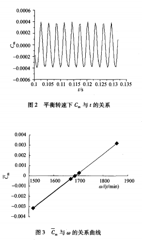 圖2即為葉輪在平衡轉速下旋轉時Cm的周期性變化過程。假定Cm為Cm值在一定計算時間內(nèi)的平均值,計算時問通常約為一個葉輪軸的旋轉周期。通過計算發(fā)現(xiàn),Cm基本上與葉輪轉速呈線性比例關系,見圖3。Cm等于零所對應的ω則表示葉輪在此轉速下旋轉達到了力矩平衡。因此在實際計算中,可以選取兩個轉速進行計算,建立Cm與ω的線性關系,然后利用此關系確定葉輪的平衡轉速。當然,預先能對葉輪處于平衡狀態(tài)下的轉速進行估計,縮小設定轉速與平衡轉速的范圍,利用這種方法確定葉輪平衡轉速的精確度將更加高。