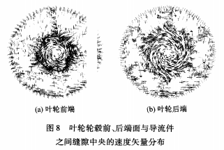 由圖8可以看到,葉輪輪轂前、后端面與導流件之間縫隙中的流體受葉輪旋轉的影響而具有明顯的圓周運動。