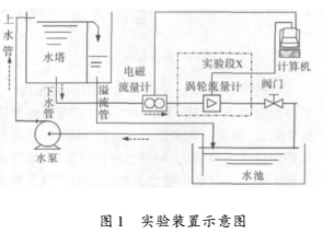 實(shí)驗(yàn)是在天津大學(xué)天津市過程參數(shù)檢測與控制重點(diǎn)實(shí)驗(yàn)室的水流量標(biāo)準(zhǔn)裝置上完成的,實(shí)驗(yàn)管徑為100mm,圖1為實(shí)驗(yàn)裝置示意圖。